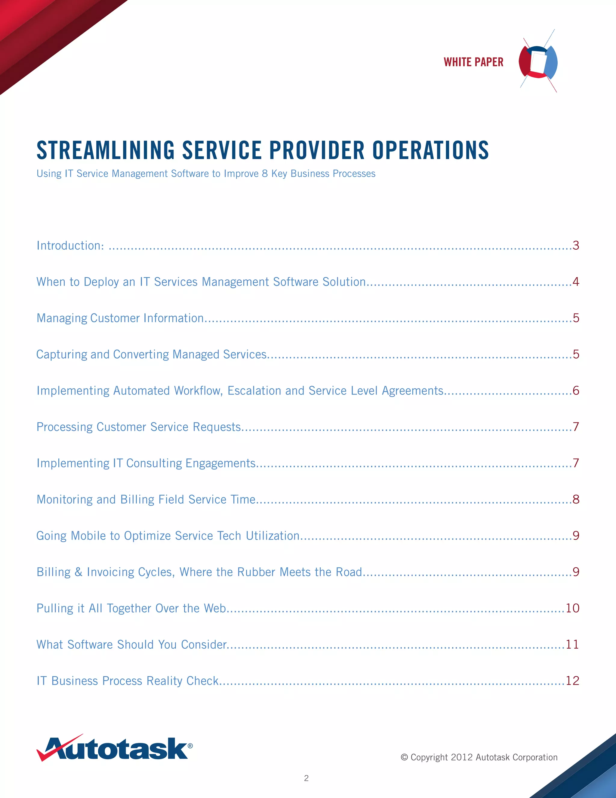 The white paper outlines how IT service management software can enhance operations for service providers by improving eight key business processes, such as managing customer information, capturing service alerts, and automating workflows. As technology demands rise, such software integrates various business functions, offering a consolidated view of client interactions and essential metrics for productivity and profitability. It emphasizes the need for streamlined operations to address challenges like scattered data and inefficient manual processes.
