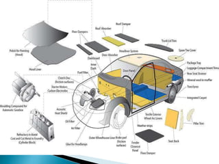 The document discusses the use of technical textiles in the automobile industry. It notes that textiles are used for over 80 parts in each car, providing functions like insulation, durability, comfort, and safety. Textiles are essential components of tires, hoses, belts, filters, composites, and safety devices. They require properties like high tenacity, modulus, temperature resistance, and are used extensively in interiors, engines, vehicle bodies, and tires. The Indian automobile industry is one of the largest and fastest growing globally.
