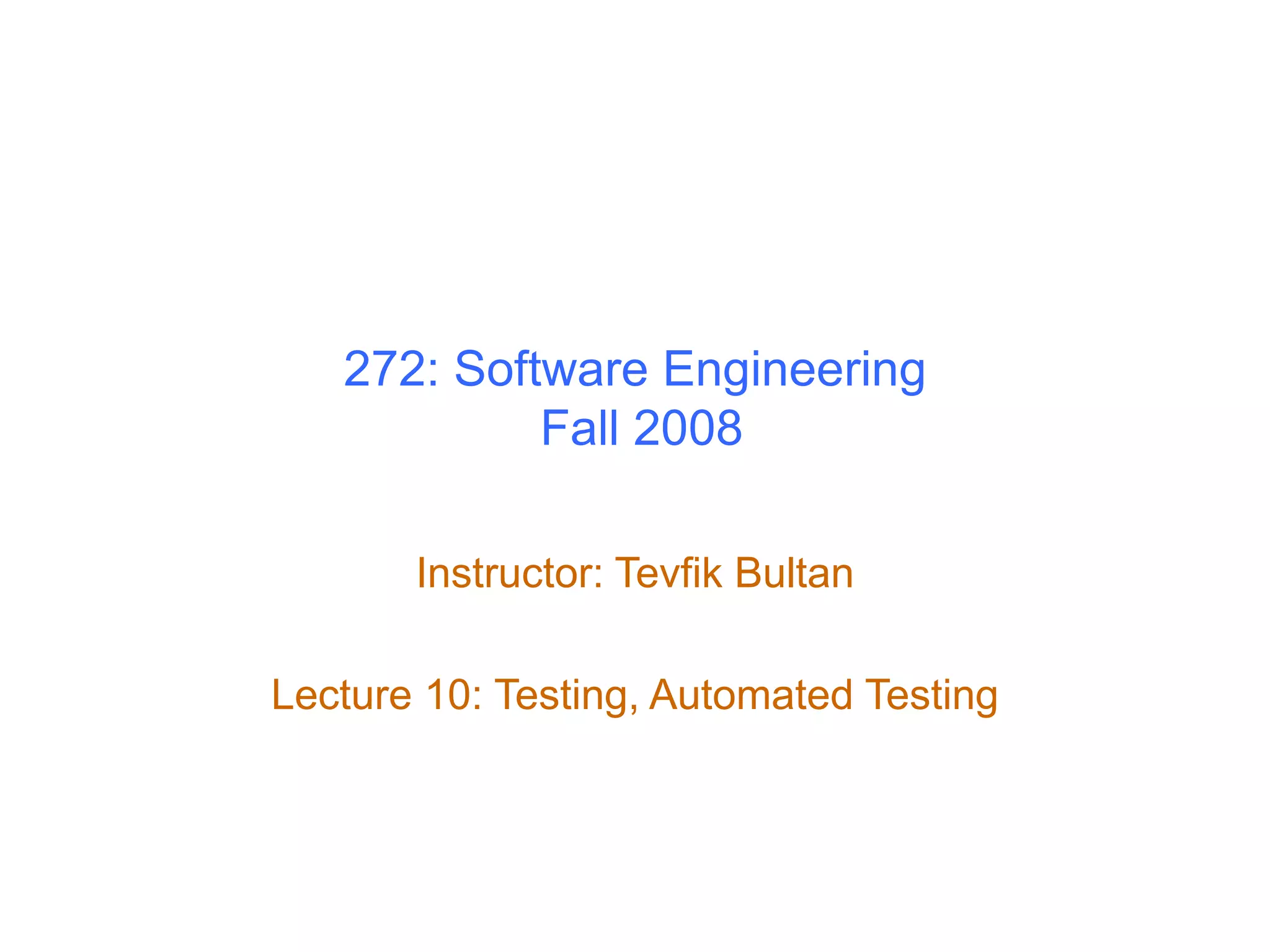 Testing software is difficult because exhaustively testing all possible inputs is impractical due to the huge number of potential test cases. Various techniques can be used to select test cases such as functional testing based on requirements, structural testing based on code structure, and testing boundary conditions and edge cases. Coverage metrics like statement coverage, branch coverage, and path coverage can help determine when enough test cases have been selected, though full path coverage is often infeasible. Condition coverage additionally aims to test all conditions in branch statements.