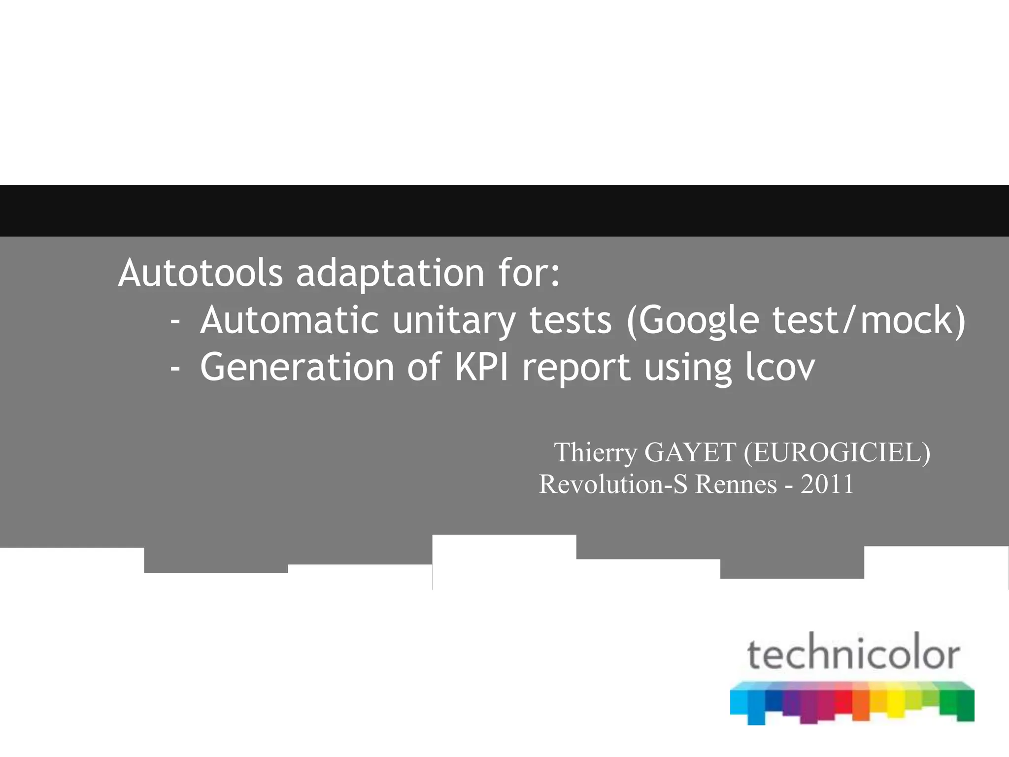 The document describes how to automate unit testing and code coverage reporting using autotools. Specifically, it discusses: