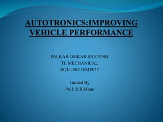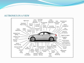 The document discusses the history and applications of automotive electronics or "autotronics". It begins with an introduction defining autotronics as the combination of automobiles and electronics. The history section outlines major milestones from the 1970s introduction of engine controls to modern innovations in infotainment and connectivity. The body details various electronic systems in braking, steering, suspension, transmission, and engine/fuel systems. It concludes by discussing ongoing research in active safety systems, vehicle communication, and adaptive technologies.