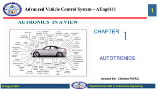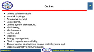 This document provides an overview of advanced vehicle control systems and automotive electronics. It begins with an outline of topics to be covered, including vehicle communication, network topology, automotive networks, bus systems, vehicle system architecture, and more. It then defines automotronics and discusses how modern vehicles rely on electronics and computer systems for functions like engine control, transmission control, stability control systems and more. The document discusses network topologies used in vehicles like bus, star and ring networks. It covers different automotive network standards and bus systems like CAN, LIN, FlexRay and MOST. Finally, it discusses requirements for automotive bus systems like data transfer rates, interference immunity and real-time capability.