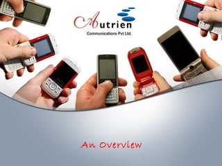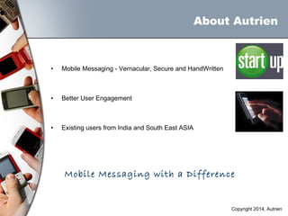 This document provides an overview of Autrien, a company that offers mobile messaging services. It discusses Autrien's focus on vernacular, secure, and handwritten mobile messaging to improve user engagement. Autrien's solutions enable privacy and security for digital services delivery through SMS, including features like user-created stickers and drawings, hand-drawn maps, and encrypted alerts. The document also presents some sample use cases and revenue models for Autrien's services.