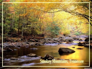 This document lists locations around the world and the autumn scenery they offer, including national parks and regions in the United States, Canada, Europe, Asia, and elsewhere. Key areas mentioned are the Smokey Mountains, Colorado, California, Alaska, Oregon, Yosemite National Park in California, Mount Rainier National Park in Washington, Adirondack Park in New York, Austria, Germany, Hungary, Poland, China, Japan, and national parks in Canada.