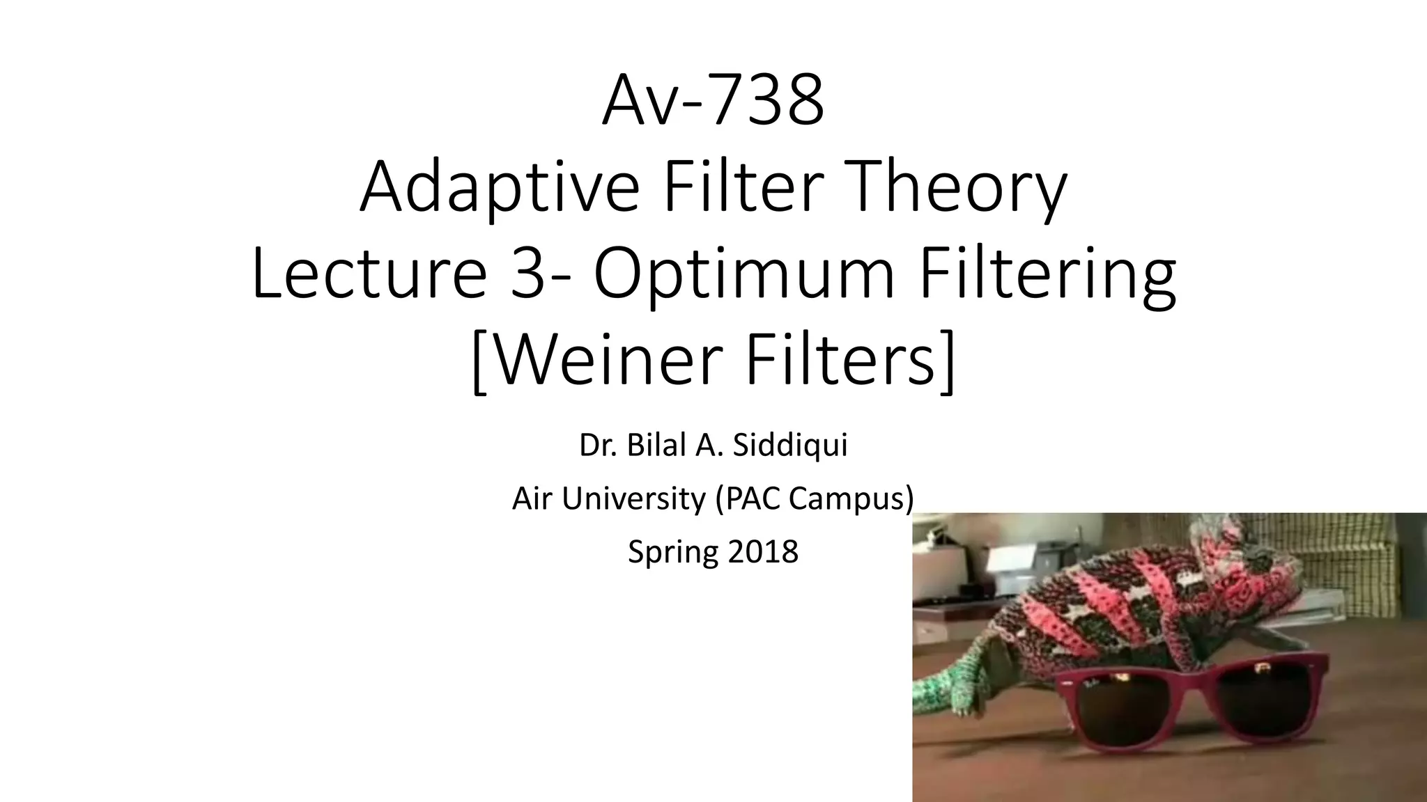 - It discusses how the Weiner filter can be used for applications like noise cancellation by estimating the desired signal using two microphones.