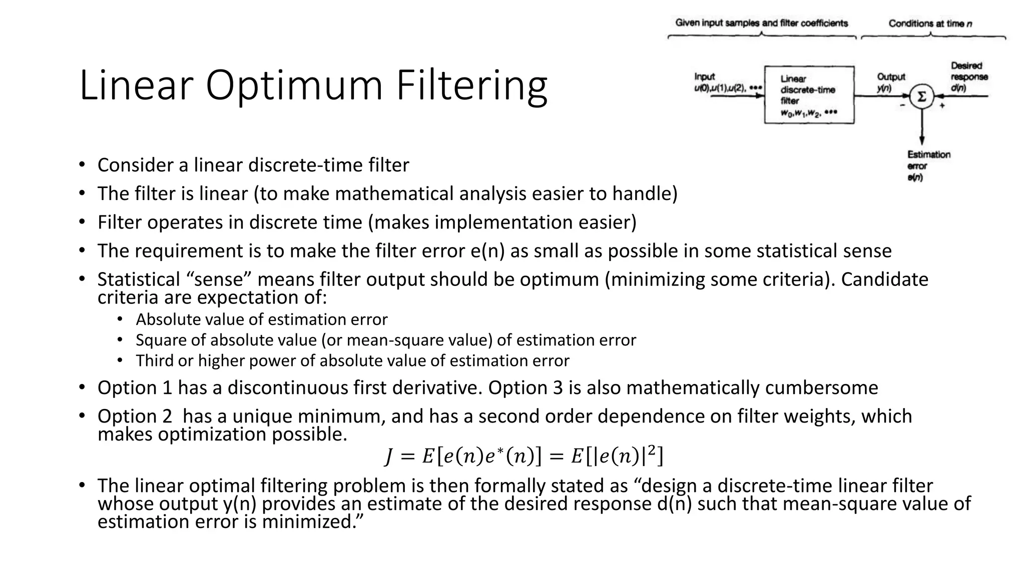 - It derives the Weiner-Hopf equation, which provides the condition for optimal filter weights to minimize the mean square error.