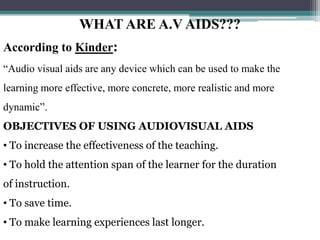 Audio visual aids are any devices that can make learning more effective, concrete, realistic, and dynamic according to Kinder. They include projected materials like slides and films, non-projected materials like books and charts, and electronic materials like computers and the internet. Using audiovisual aids has benefits like helping audiences understand and remember presentations better. Guidelines for designing effective audiovisual aids include using simplified drawings, colors, titles, and interactive multimedia systems.