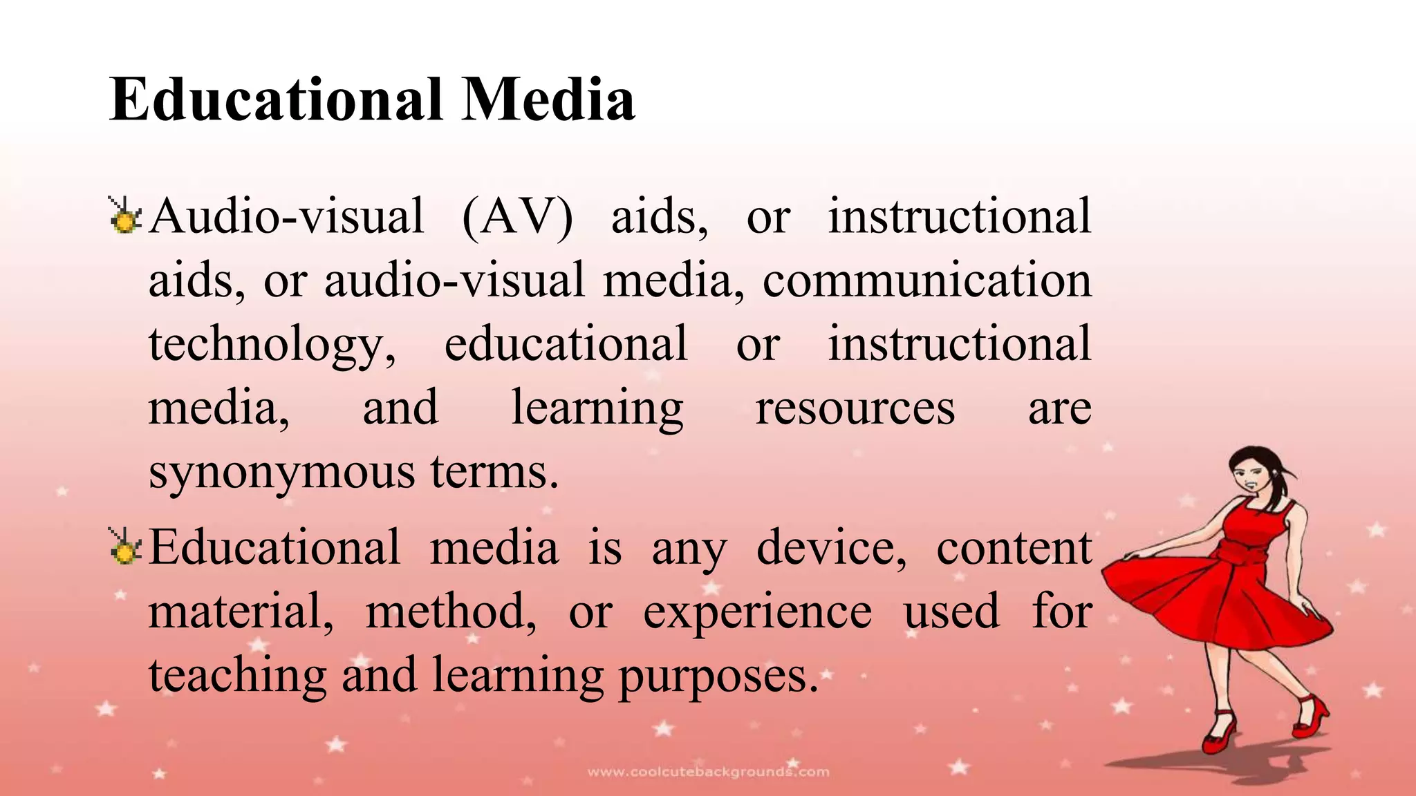 Educational media refers to any device, content, or experience used for teaching and learning, including audio-visual aids. Audio-visual aids are defined by various experts as sensory objects or images that initiate and reinforce learning, make the learning experience more concrete and realistic, and help complete the process of learning through motivation, classification, and stimulation. The main purposes of audio-visual aids are to provide effective perceptual and conceptual learning, sustain student attention and involvement, increase the meaningfulness of concepts, and stimulate thinking and action.
