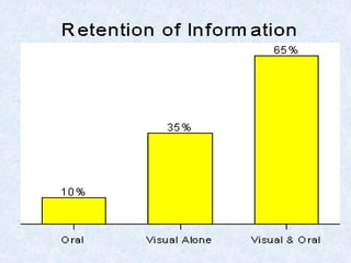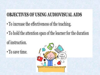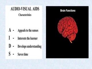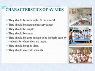 The document discusses educational media and audio-visual aids. It defines educational media as things that can be manipulated, seen, heard or talked about to facilitate learning. It then outlines the purposes, principles, sources and types of audio-visual aids. Sensory learning is emphasized, with 83% of information acquired through sight and multimedia approaches recommended. Proper selection, preparation, use and evaluation of aids are principles that are covered.