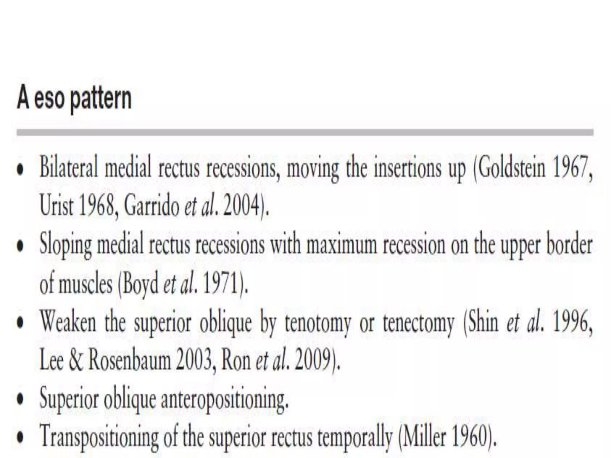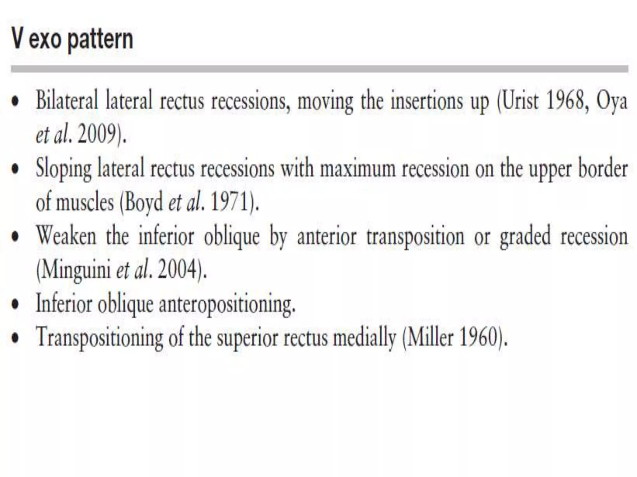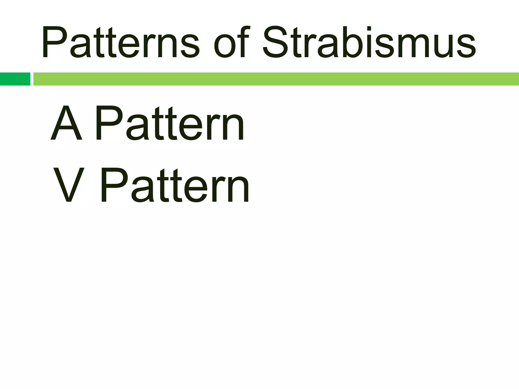 The document discusses patterns of strabismus, specifically the A pattern and V pattern. The A pattern involves relative convergence on upgaze and divergence on downgaze, while the V pattern is the opposite with relative divergence on upgaze and convergence on downgaze. Variants include the X, Y, lambda, and diamond patterns. The etiology of these patterns involves dysfunction of the horizontal, vertical, or oblique eye muscles. Clinical features may include anomalous head posture, amblyopia, and abnormal retinal correspondence. Diagnosis involves measuring alignment in upgaze and downgaze while preventing accommodation.