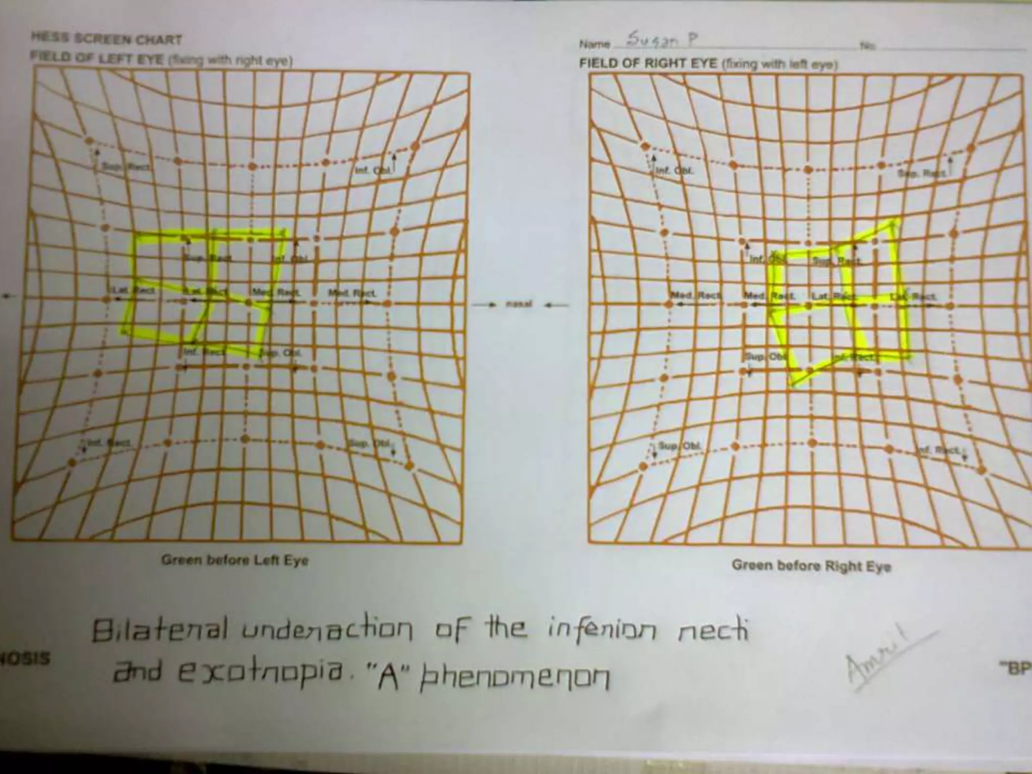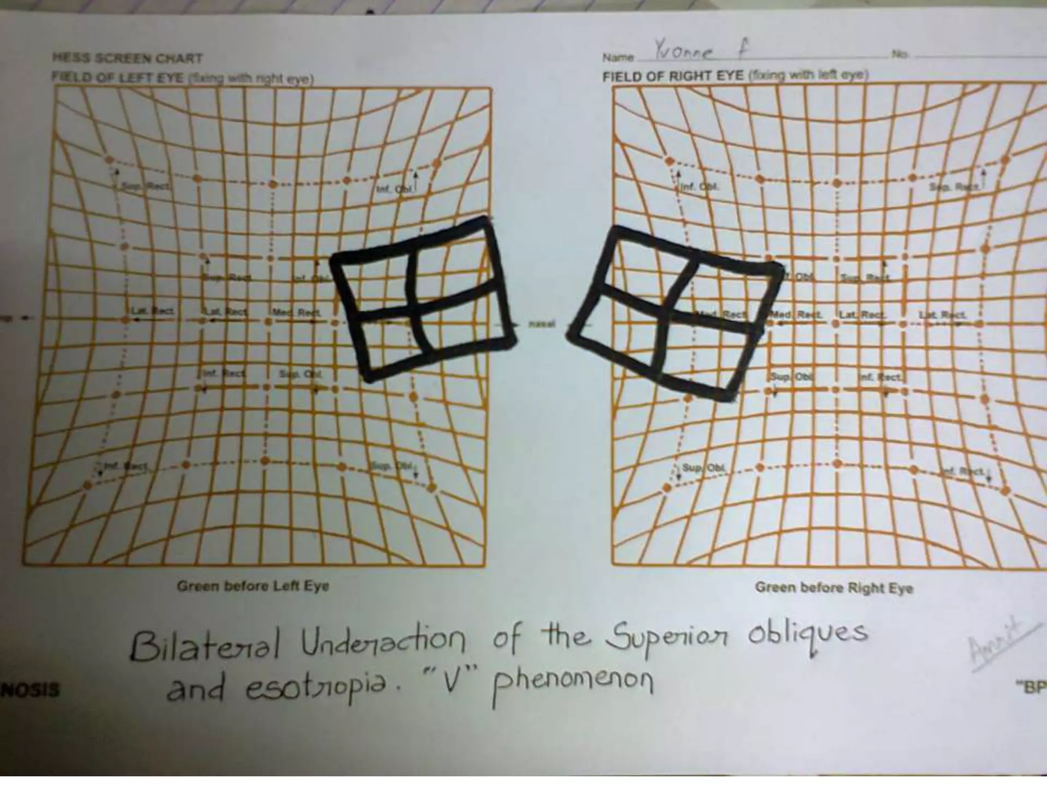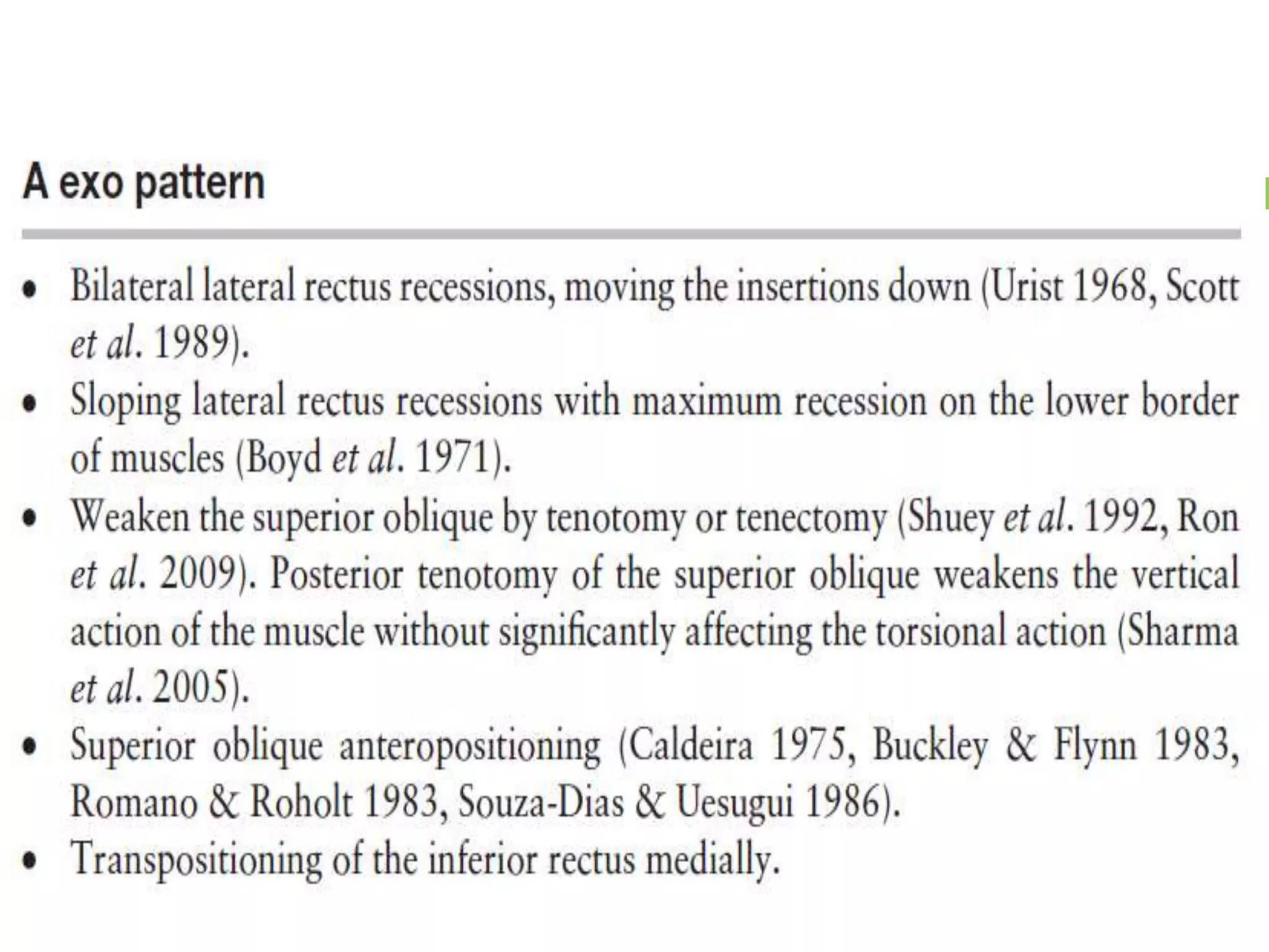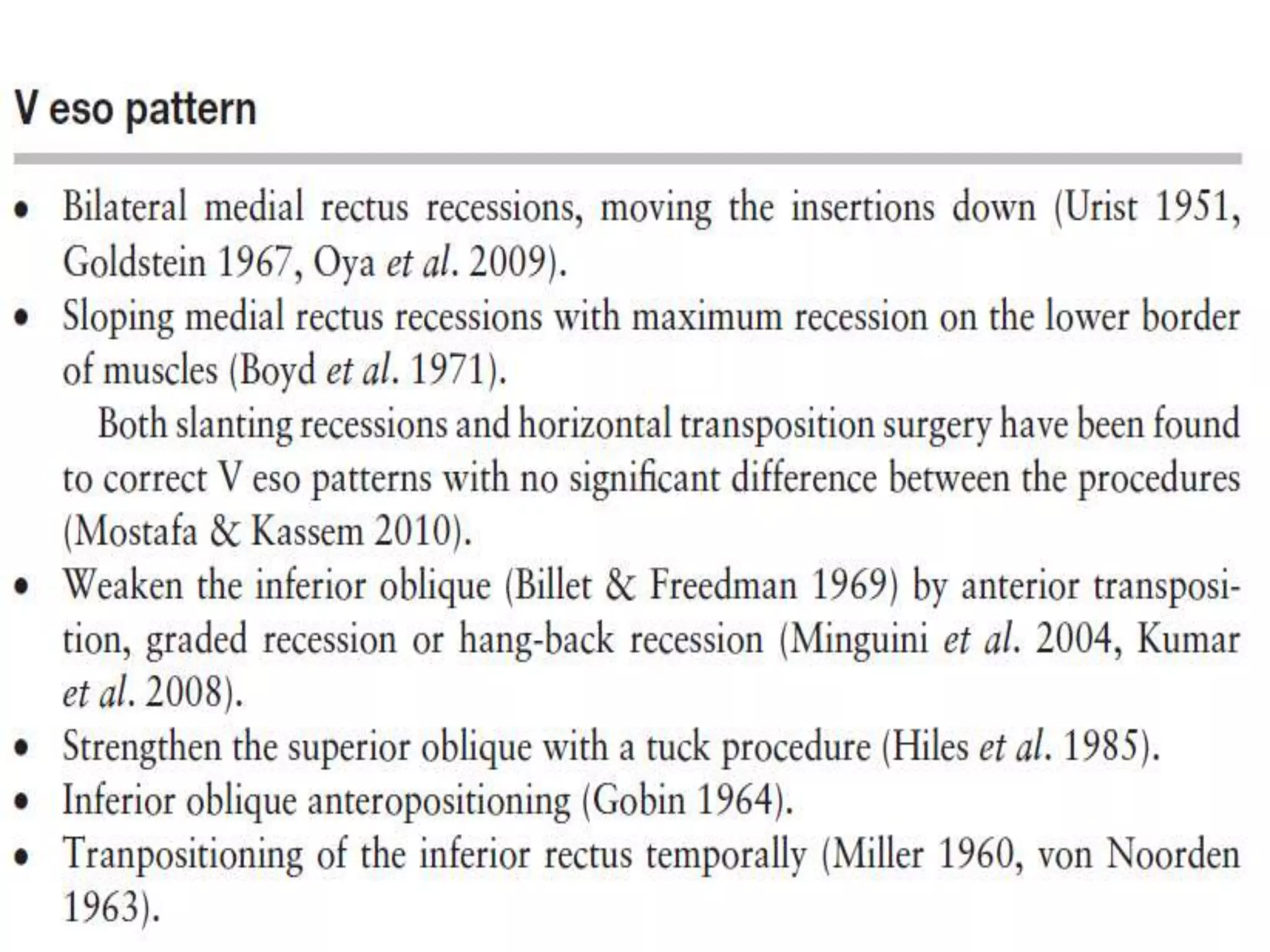 The document discusses patterns of strabismus, specifically the A pattern and V pattern. The A pattern involves relative convergence on upgaze and divergence on downgaze, while the V pattern is the opposite with relative divergence on upgaze and convergence on downgaze. Variants include the X, Y, lambda, and diamond patterns. The etiology of these patterns involves dysfunction of the horizontal, vertical, or oblique eye muscles. Clinical features may include anomalous head posture, amblyopia, and abnormal retinal correspondence. Diagnosis involves measuring alignment in upgaze and downgaze while preventing accommodation.