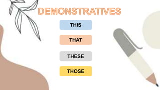 The document explains the use of demonstrative pronouns 'this', 'that', 'these', and 'those' to refer to singular and plural nouns based on proximity and time. It provides guidance on when to use each term depending on whether the noun is near or far, and whether the action is in the present, near future, or past. Additionally, it includes example sentences and practice questions for clarity.