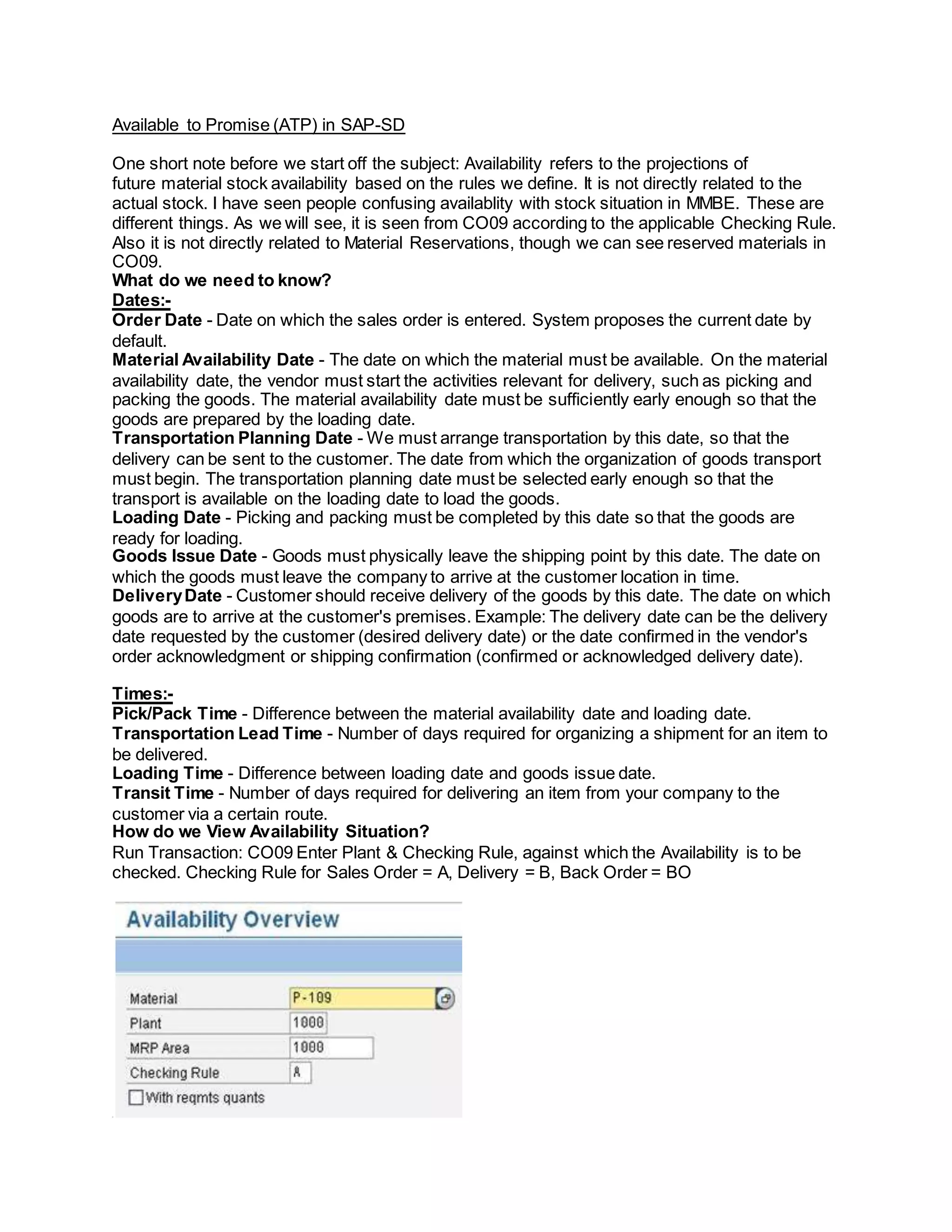 This document provides an overview of available to promise (ATP) in SAP-SD. It discusses what ATP is, how to view the ATP situation using transaction CO09, and how the system arrives at a confirmed delivery date using backward and forward scheduling based on availability. It also outlines the key dates, times, and configurations needed for ATP checks, including requirements type, class, strategy group, checking group, rule, and scope. ATP projections are based on defined rules and are not the actual stock situation.