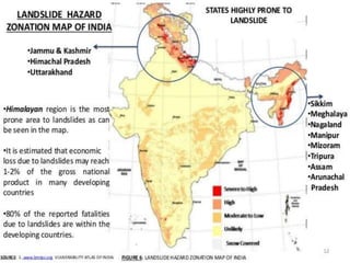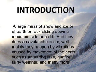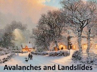 Avalanches and landslides are large masses of snow, ice, earth, or rock that slide down mountainsides or cliffs. They are commonly caused by natural events like earthquakes, heavy rain, volcanic eruptions, or forest fires, but can also be triggered by human activities like mining, construction, or deforestation. When they occur, avalanches and landslides can lead to economic losses, damage infrastructure, cause loss of life, impact landscapes and river ecosystems. There are different types of avalanches defined by the type of snow involved and different types of landslides defined by how the earth or rock moves. Prevention methods include early warning systems, monitoring, and controlling human activities that could trigger them.