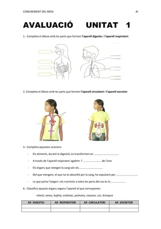 1.- Completa el dibuix amb les parts que formen l’aparell digestiu i l’aparell respiratori:
