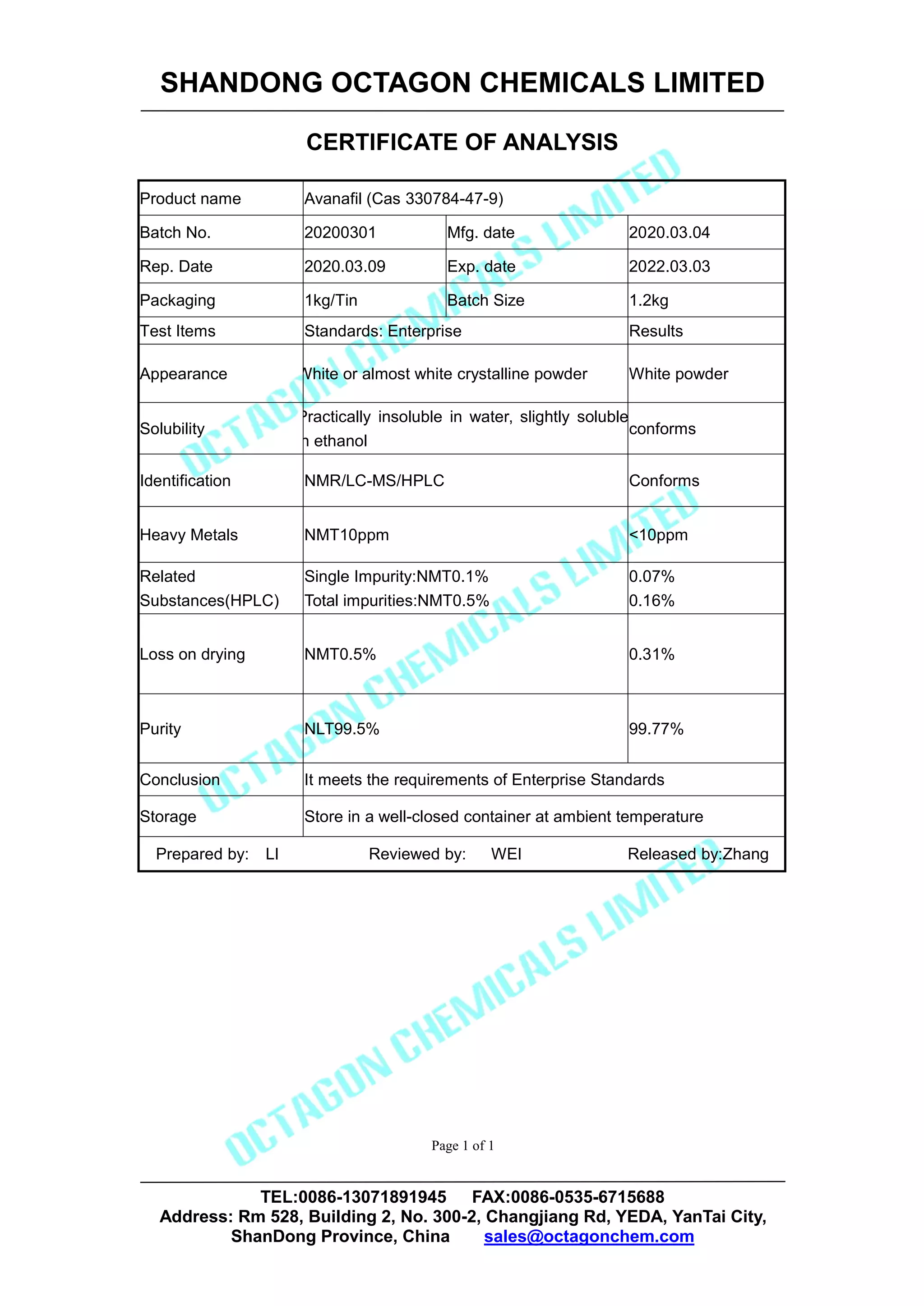 This certificate of analysis from Shandong Octagon Chemicals Limited summarizes the results of quality testing of Avanafil batch number 20200301. The tests show the white powder conforms to enterprise standards for appearance, solubility, identification, heavy metals, related substances, loss on drying, and purity. The certificate concludes the batch meets all requirements and should be stored in a well-closed container at ambient temperature.