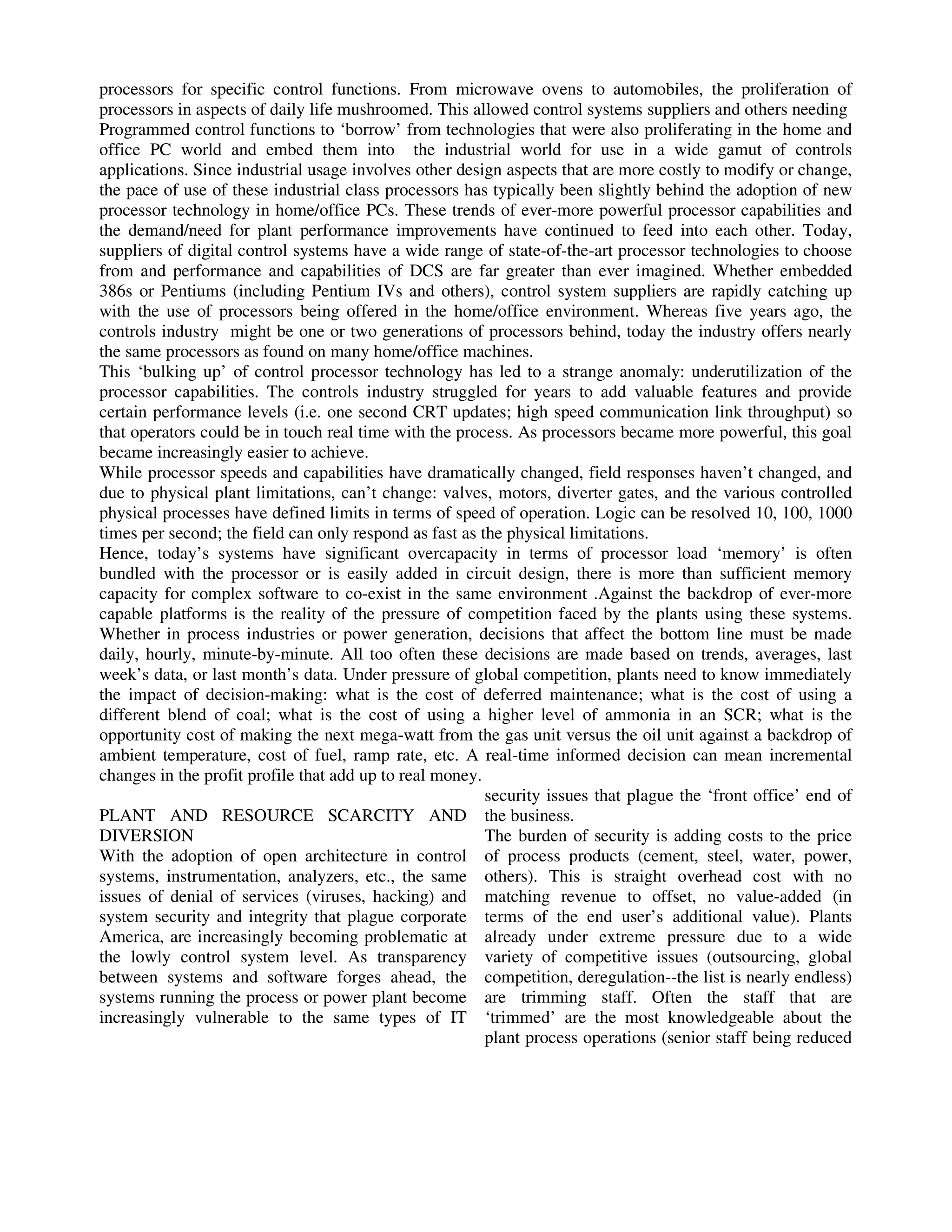 This document discusses how digital control systems have become more powerful over time due to advances in processor technology. While control system processors are now much faster than needed for basic control functions, this excess capacity is currently underutilized. The document proposes embedding asset management, performance monitoring, and other software applications within the control system itself to better leverage the processing power. This integrated approach within a single system could improve plant operations, decision making, and reduce IT overhead costs compared to current separate server-based systems.