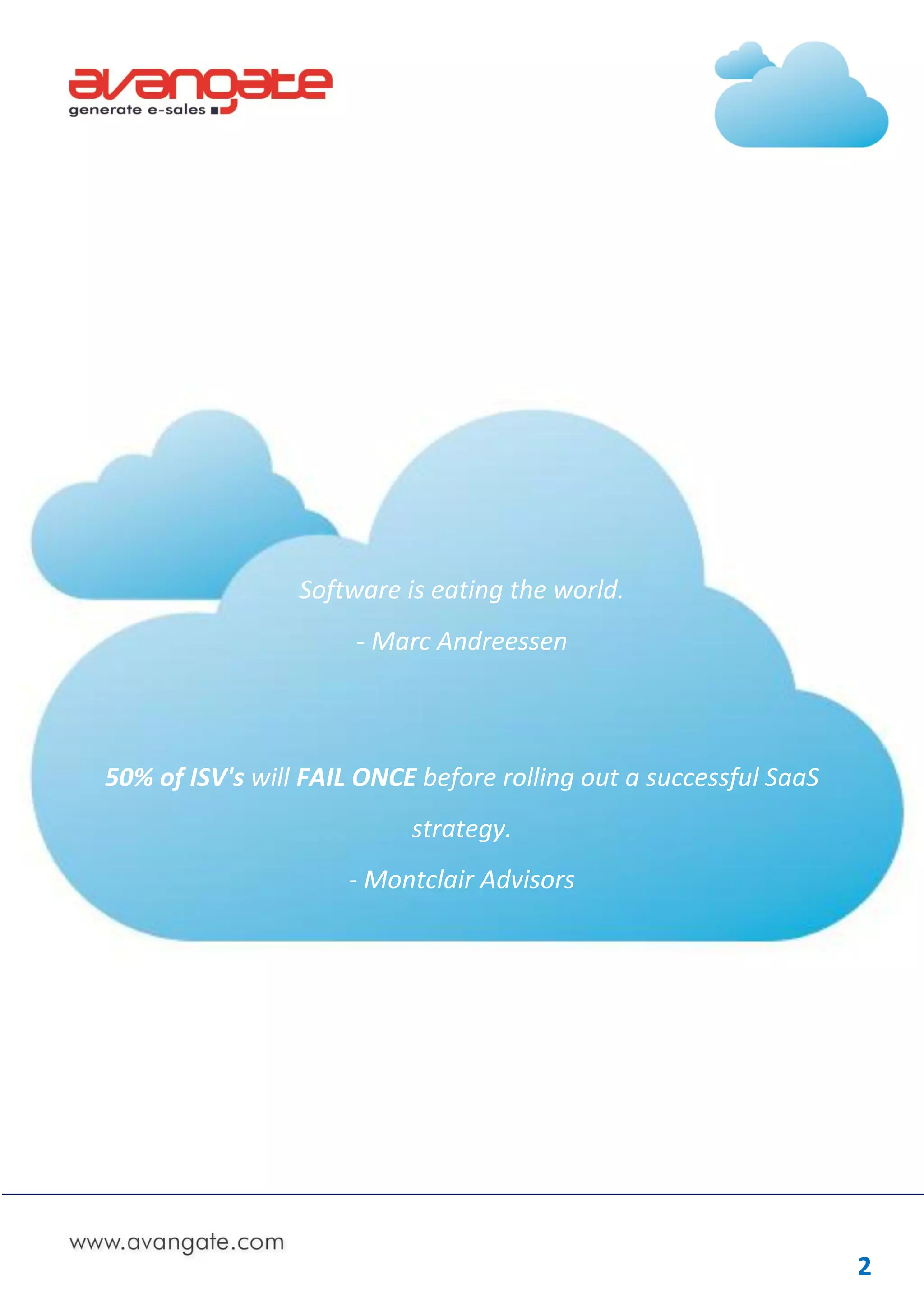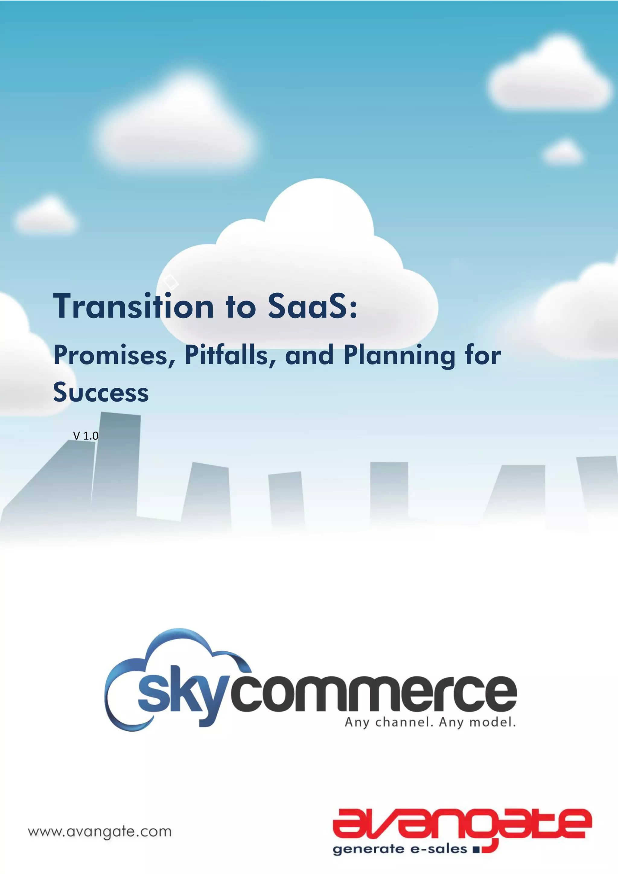 This document provides guidance for traditional software companies transitioning to a Software as a Service (SaaS) model. It discusses the industry shift toward SaaS delivery and the challenges and opportunities companies will face. It outlines four transition archetypes - traditional, hybrid, cross-over, pure SaaS - and recommends a five step process for a successful transition: 1) start with the desired end state in mind, 2) think customers first, 3) build a lead generation machine, 4) sell a service not a product, and 5) drive customer success. The document provides advice on segmentation, costs, automation, metrics and building a customer community to support the transition.