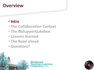 This document describes the creation of a collaborative "BbSupportjukebox" by multiple universities in the Netherlands to share Blackboard support materials. Universities collaborated to create over 200 support items and organize them into a searchable online jukebox. The jukebox allows users to easily find support documents on a variety of Blackboard topics. Creating shared materials leveraged each university's resources and allowed dynamic updating. The collaboration was deemed a success and the jukebox format may be expanded to other types of institutional support beyond just Blackboard.
