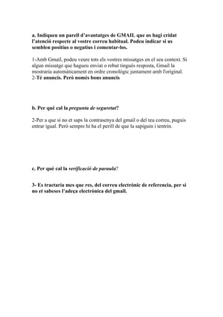 Avantatges 1. a. Indiqueu un parell d’avantatges de GMAIL que us hagi cridat
