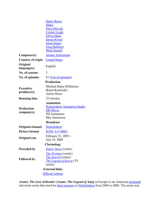 Avatar: The Last Airbender is an American animated television series that aired for three seasons on Nickelodeon from 2005 to 2008. It is set in a world where some humans can manipulate the classical elements through bending arts. The story follows Aang, the last surviving Airbender and Avatar, and his friends Katara and Sokka who must master the bending arts and bring peace to the world by defeating the Fire Nation. Over the course of the series, Aang learns waterbending, earthbending, and firebending to fulfill his duty as the Avatar.