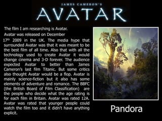 The document provides information about the film Avatar, including its release date, director James Cameron, expectations and hype surrounding the film, plot details about the human characters Jake Sully and Neyteri on the alien moon Pandora, and how the film's trailer, poster, and magazine and website promotions build anticipation for the groundbreaking film.