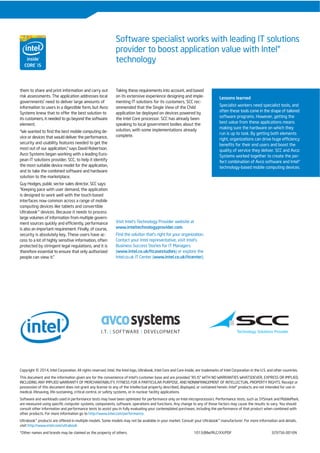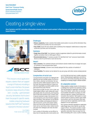 Avco Systems created a software application called Single View of the Child to centralize information for social workers from multiple sources into a single interface. This would allow social workers accessing the information from mobile devices in the field. SCC identified Intel Core processor-based mobile devices as best suited for the application due to their ability to process large amounts of data quickly, support touchscreens, and provide security for sensitive information. Some local governments have already deployed the combined software and hardware solution to hundreds of employees to improve social workers' effectiveness.