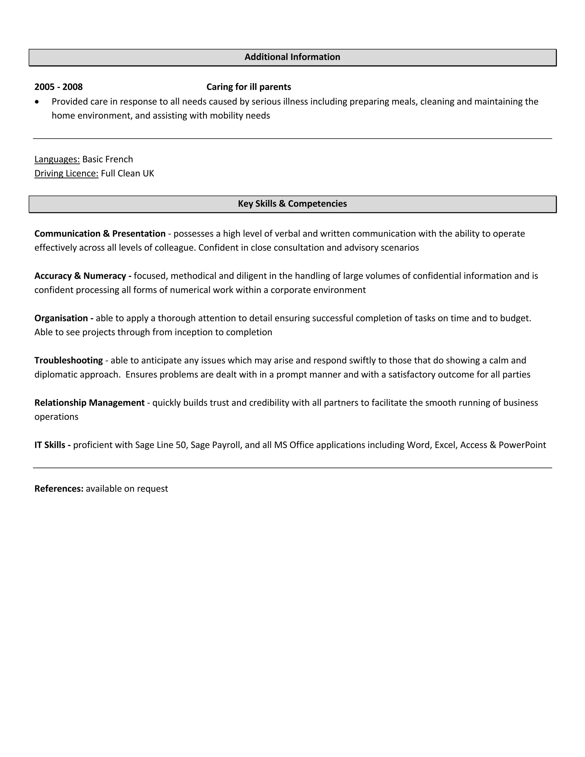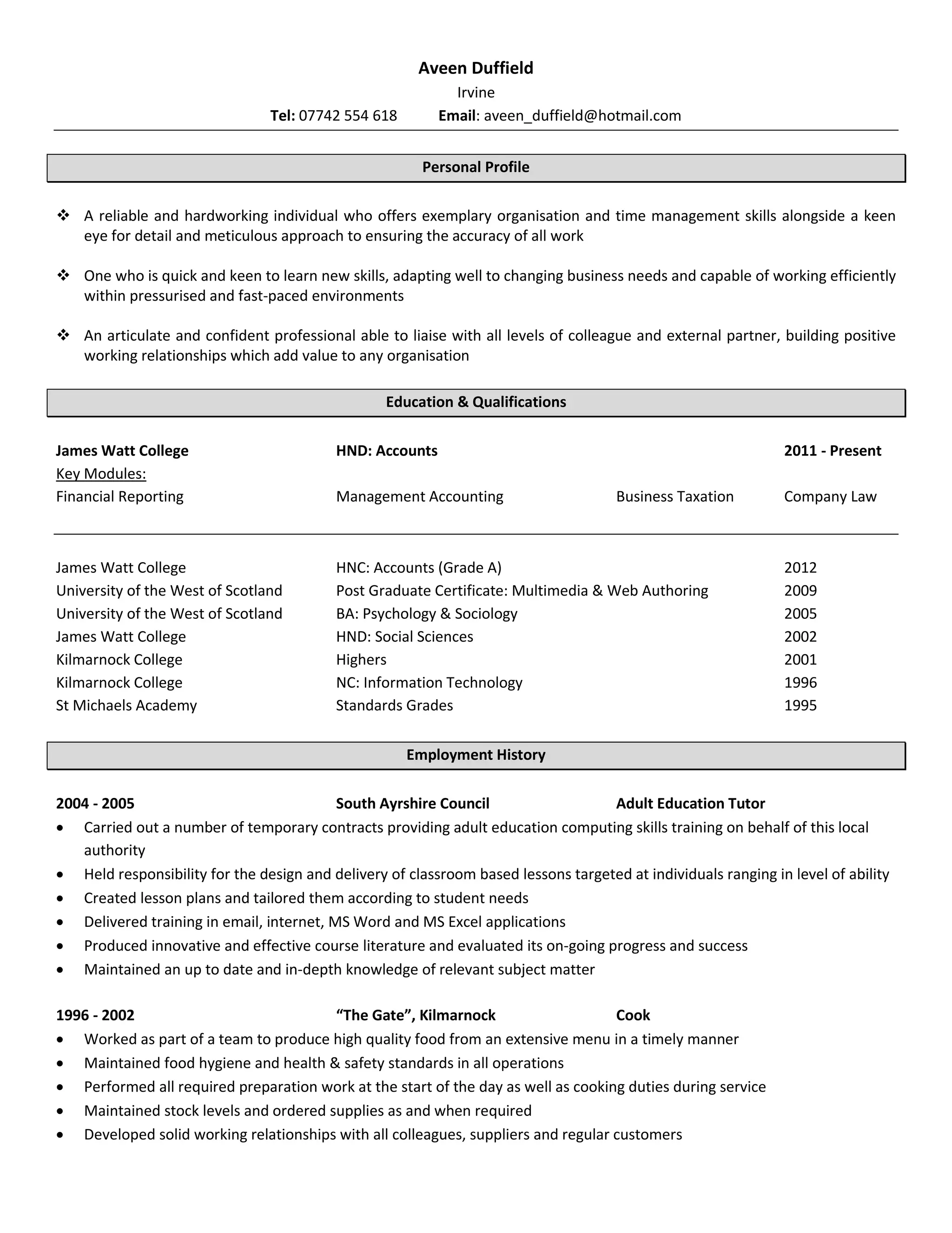This document provides a summary of Aveen Duffield's qualifications, skills, and work experience. She has an HND in Accounts from James Watt College from 2011 to present. Her previous work experience includes being an adult education tutor from 2004 to 2005 and working as a cook from 1996 to 2002. She has strong communication, organization, and IT skills.