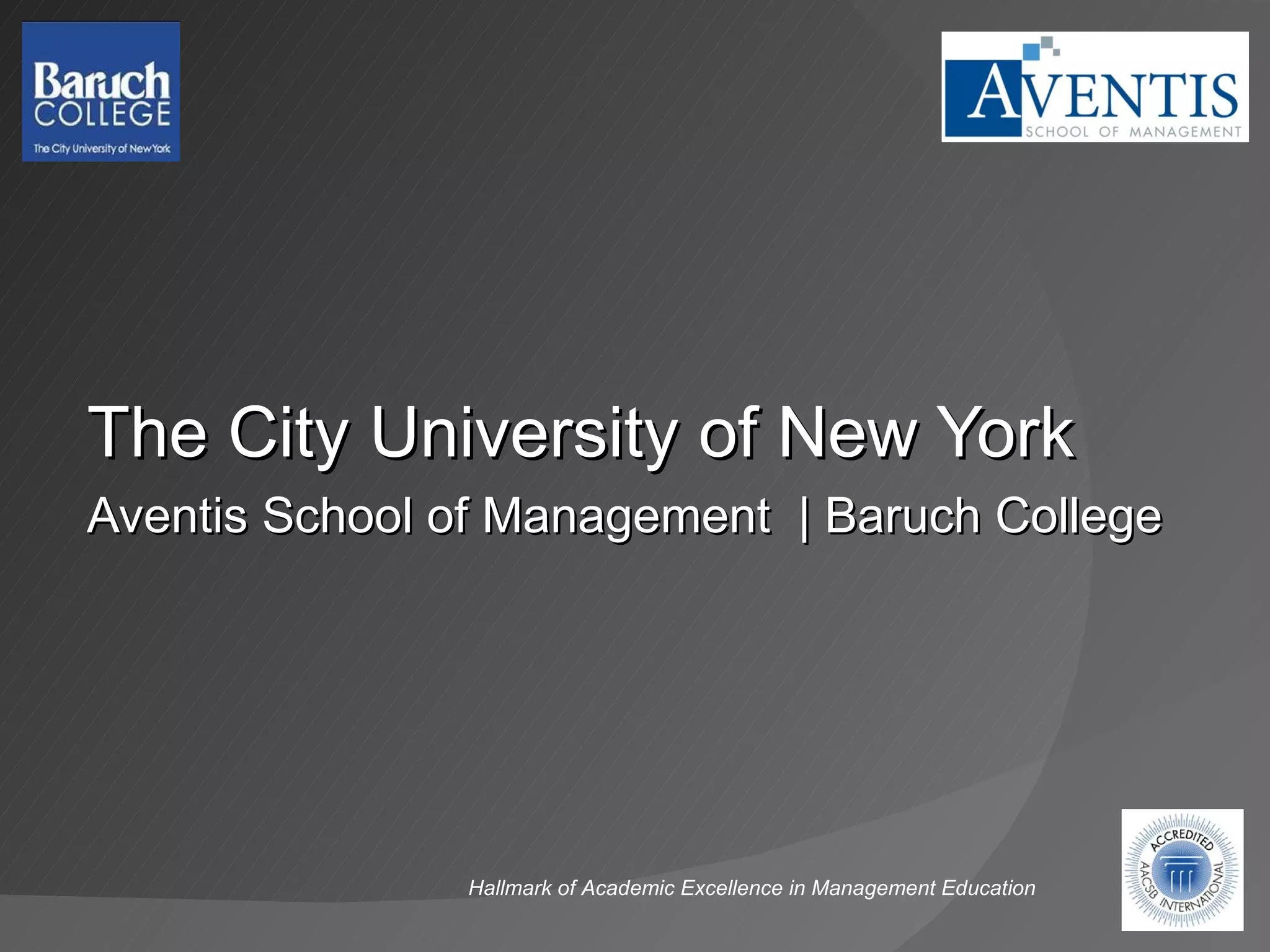 The document provides information about the City University of New York (CUNY) and Baruch College. It discusses CUNY's history and accomplishments, including that it is America's largest urban public university with over 400,000 students and 12 Nobel laureates. It also profiles Baruch College and its Executive MBA and Master of Science programs, highlighting their rigorous curricula taught by world-renowned faculty and emphasis on blending theory with real-world applications.