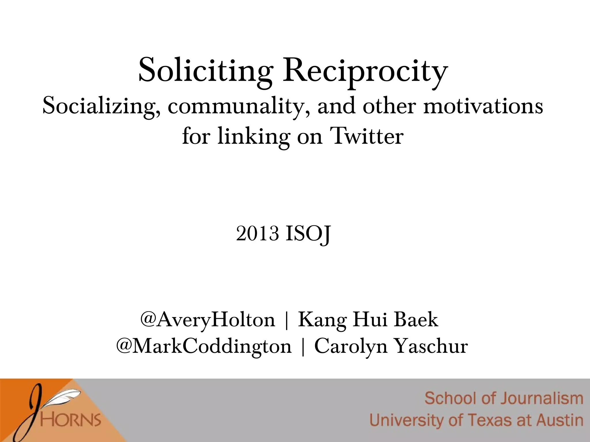 This document summarizes a study that examined Twitter users' motivations for sharing links. The researchers conducted a survey of 396 Twitter users to measure eight potential motives for link sharing: information seeking, information sharing, interpersonal utility, convenience and entertainment, passing time, social support, control, and promoting work. Through factor analysis, they identified six categorical motives: information seeking, information sharing, interpersonal utility, convenience and entertainment, passing time, and control and promoting work. The results showed information sharing was the most salient motive, and information sharing correlated most strongly with control/promoting work and convenience/entertainment. Regression analysis found control/promoting work and information seeking were significant predictors of higher link-sharing frequency, while