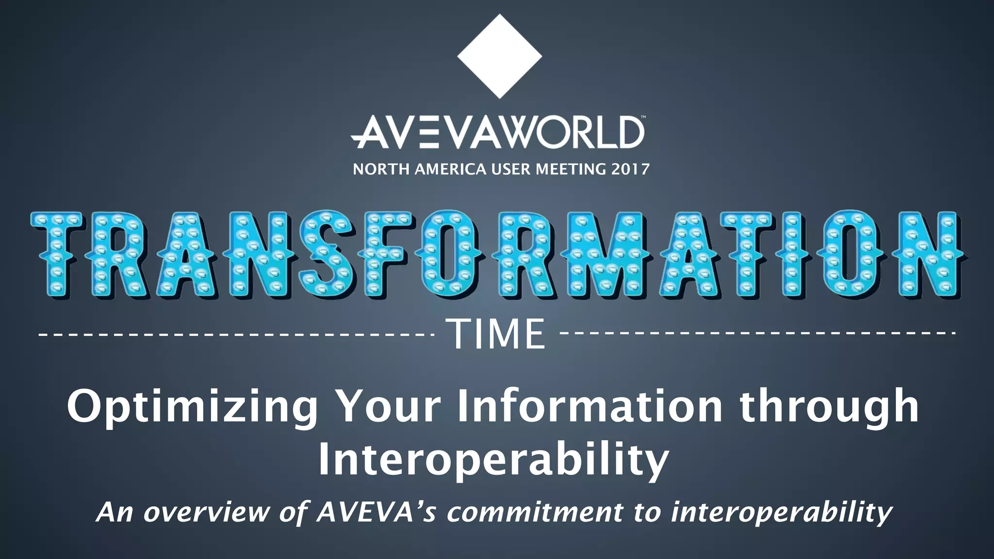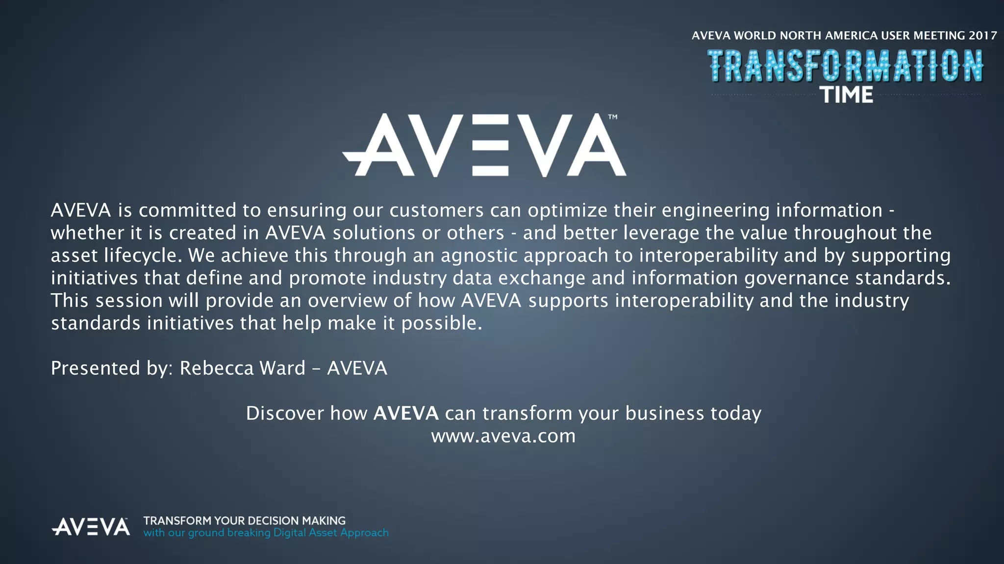 The document provides information about an AVEVA event discussing interoperability. It will include an overview of how AVEVA supports interoperability through industry standards and initiatives. Rebecca Ward from AVEVA will present on AVEVA's commitment to interoperability and how it helps customers optimize engineering information across asset lifecycles. The presentation will cover AVEVA's agnostic approach, support for standards like ISO 15926 and 10303, and benefits of interoperability for projects and operations.