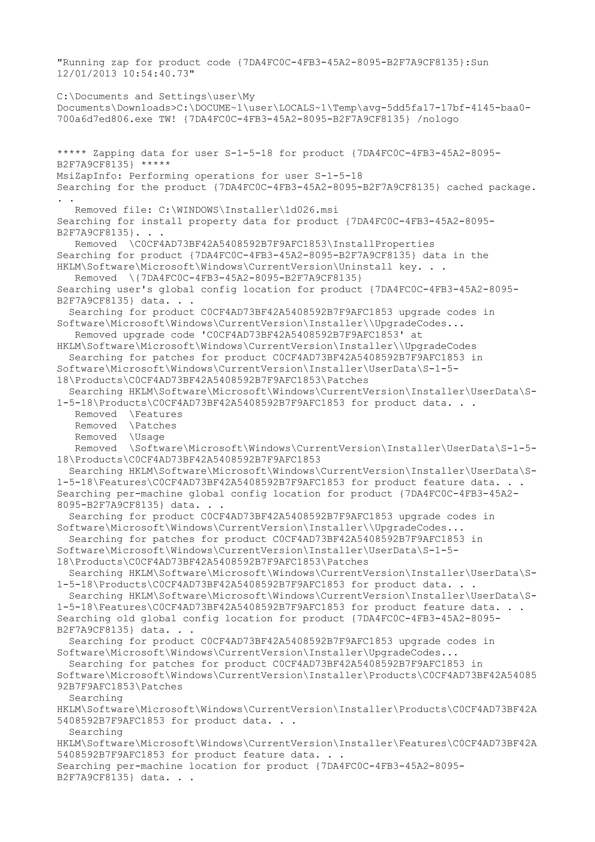 The document describes the process of running a zap tool to remove all traces of a product with the ID {7DA4FC0C-4FB3-45A2-8095-B2F7A9CF8135} from a computer. It searches the system registry, files, and other locations to remove entries and files associated with the product. It lists all the specific keys and files that were removed during the zap process.
