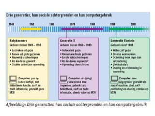 Generaties en internetGeneratie X – geboren tussen 1961 en 1977 Generatie Nix of Verloren Generatie Generatie Y – geboren tussen 1978 en 1994 Millenniumgeneratie, Generation Next, Internetgeneratie of Sociale generatie Generatie Z – geboren na 1994 In hoge mate verbonden o.a. via internet: Digital Natives, Generatie M, Generatie Einstein, Netwerkgeneratie, Generatie Web 2.0