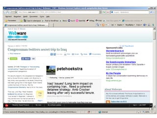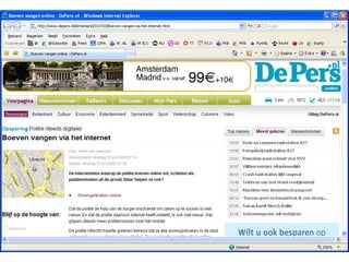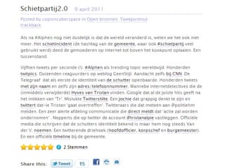 Zes trends in2.0 4. Internet als platform Internet als enabler (laat het gebeuren) 5. Openheid = norm Voorwaarde voor co-creatie / crowdsourcing Wat is nog besloten? 6. Alles beta Producten zijn nooit af maar altijd in ontwikkeling – door de crowd Wiki!