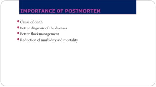 A postmortem examination of birds provides important information about the cause of death and diseases affecting the flock. The examination procedure involves obtaining a flock history, external examination of the bird for abnormalities, and internal examination of the organs. During internal examination, lesions in various organs can provide clues to diagnose diseases like avian influenza, fowl pox, Marek's disease, and others. A thorough postmortem is important for better disease diagnosis, flock management, and reducing morbidity and mortality.