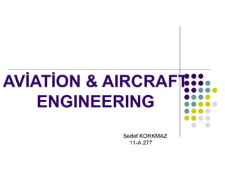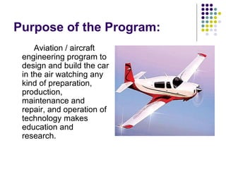 The document provides information about the aviation and aircraft engineering program. It discusses the purpose of the program, which is to design, build, maintain, and repair aircraft and related technology. It lists the necessary skills, including mathematics, physics, chemistry, and the ability to draw shapes. The occupational training period is 4 years. The tasks involve drafting aircraft construction plans, production planning, and maintenance engineering. A bachelor's degree in aircraft engineering qualifies graduates for jobs as aircraft, aerospace, or aeronautical engineers. Master's programs offer courses in aircraft performance, propulsion systems, and other aerospace topics.
