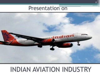 The document provides an overview of the Indian aviation industry. It begins with an introduction to the industry, highlighting its growth and key characteristics. It then discusses the history of aviation in India and provides statistics on the current market size. The top players in the industry such as Indigo, Jet Airways, and SpiceJet are introduced along with details on their profiles, management, finances and operations. Challenges facing the industry and future projections for growth are also summarized. The presentation concludes with a discussion of various initiatives by the government to support development of the aviation sector in India.