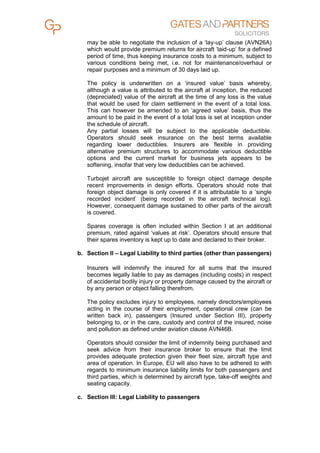 This document discusses key aspects of aviation insurance for business and private aircraft. It outlines the standard sections of an aviation insurance policy, including coverage for damage to the aircraft hull, legal liability to third parties and passengers. It also examines exclusions for risks such as war, hijacking and other perils, and options for operators to purchase additional coverage to insure against these excluded risks. Maintaining adequate coverage limits and being aware of policy restrictions is important for aircraft operators and owners.