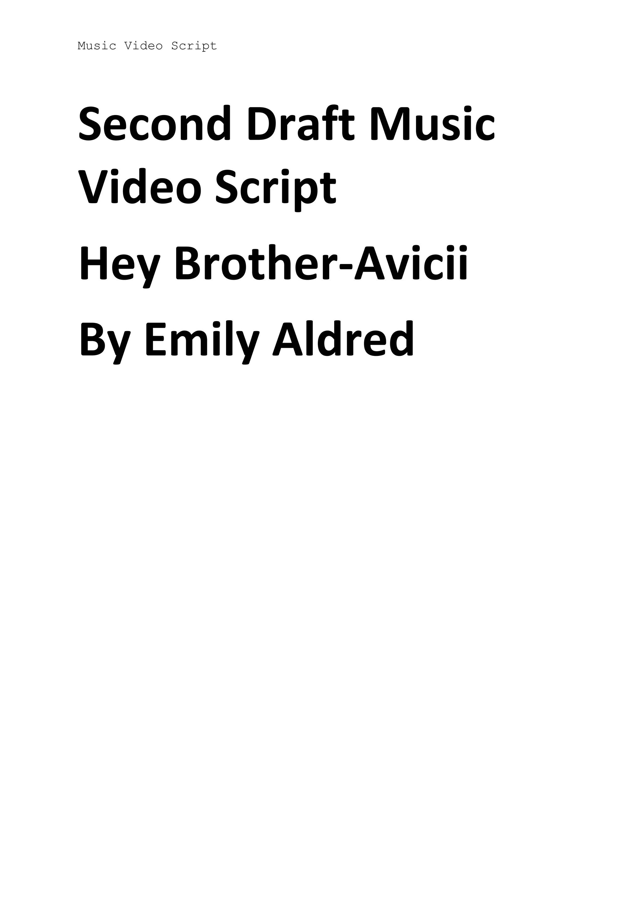 The document is a second draft music video script for Avicii's song "Hey Brother". The script outlines 15 scenes that tell a story through shots of a brother and sister reconnecting. It begins with each separately boarding a train or bus while listening to the song. Subsequent scenes show them walking alone in their towns. They eventually meet up and hug, walking together to their abandoned childhood home while the music plays. The last shot zooms out from a photo of them as children in front of the house. The script provides direction for visuals and synchronization with the song's lyrics and music.