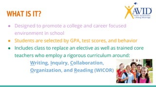 Advancement Via Individual Determination (AVID) is a program designed to promote a college-focused environment and rigorous curriculum. It selects students based on GPA, test scores, and behavior. In the AVID elective class, students receive tutoring, organization training, and college preparation. The program expects collaboration from students, parents, teachers, and administration to help students succeed academically through assessment, field trips, and academic support.