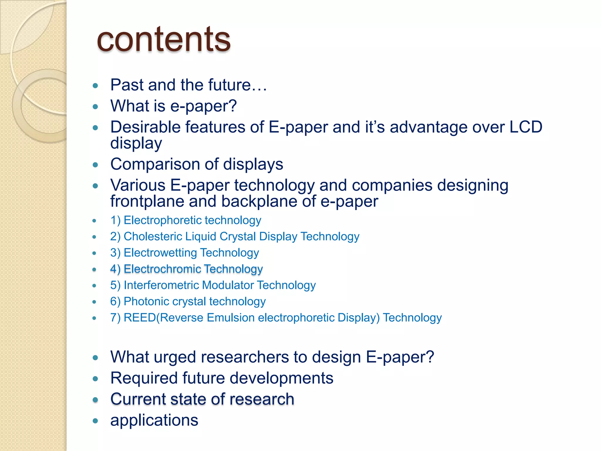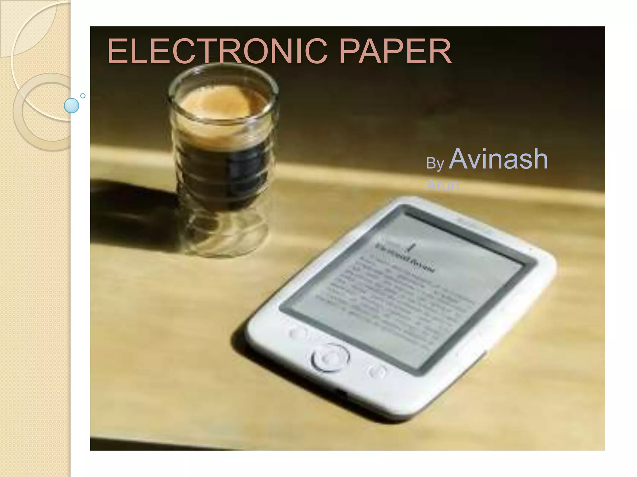 This document discusses electronic paper (e-paper), which aims to create a paper-like display with properties such as high contrast, light weight, and very low power consumption. It describes several types of e-paper technologies being researched, including electrophoretic, cholesteric liquid crystal, electrowetting, and electrochromic technologies. The document also notes desirable features like flexibility and video capability, and applications of e-paper like e-readers, watches, phones, and digital textbooks. Researchers are working to develop full-color e-paper and improve refresh rates to enable uses like e-books and mobile devices.