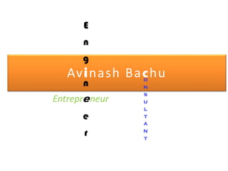 Avinash Bachu is an entrepreneur and consultant engineer who started his own consultancy after graduating from the Indian Institute of Technology-Roorkee with a scholarship. His consultancy focuses on design, construction, and contracting for power utilities and renewable energy projects. He has conducted feasibility studies and reports, helped companies obtain loans, and designed solar power systems for farmers. Avinash has skills in feasibility studies, documentation, project management, design, teamwork, and experimenting with new technologies. He can be contacted at avinashsiri@gmail.com or by phone.