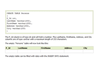 3) SQL also includes statements for defining the structure of a database through data definition language commands like CREATE DATABASE, CREATE TABLE.