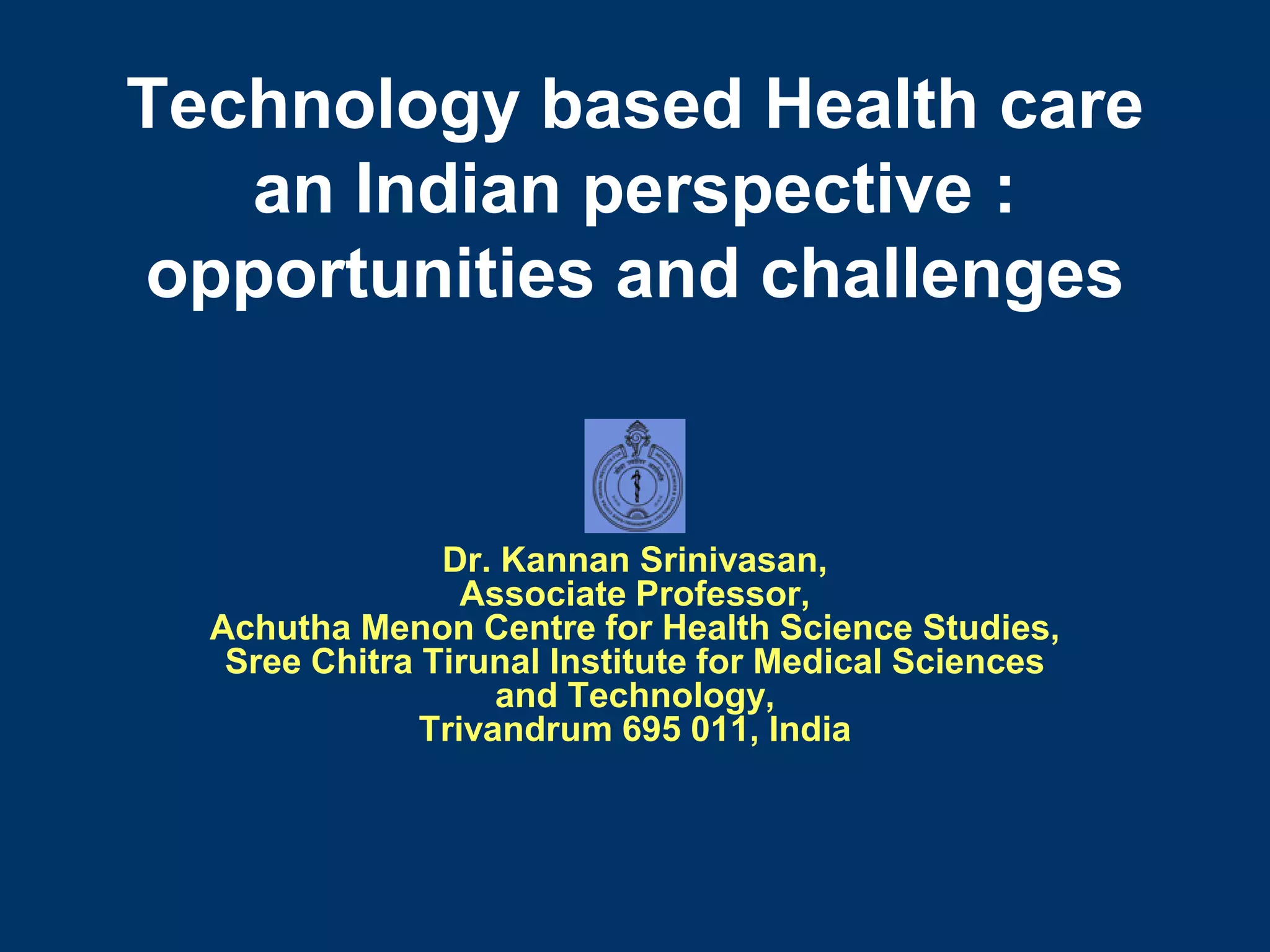 Technology based healthcare in India faces several opportunities and challenges. While technologies like telemedicine, medical imaging, and health information systems have benefits, their utilization remains limited due to issues like high costs, lack of trained personnel, low awareness among the population, and insufficient infrastructure support. Emerging areas that could enhance healthcare if properly implemented include AI, robotics, digital libraries, and personalized online health systems. However, overcoming limitations such as vendor lock-in, high training requirements, and interoperability issues will be important for the successful adoption of these technologies in India.