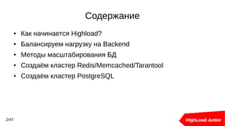 Документ рассматривает подходы к созданию кластеров баз данных для обработки высоких нагрузок. В нем освещаются методы балансировки, масштабирования и обеспечения отказоустойчивости для Redis и PostgreSQL, включая использование прокси-серверов и репликации. Ключевыми темами являются шардирование, автоматическое переключение при отказах и оптимизация подключения к базе данных.
