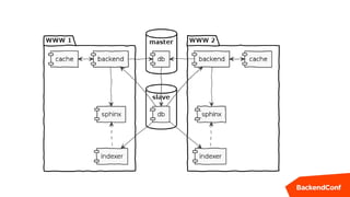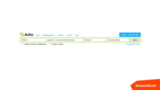 Документ описывает архитектуру поисковых сервисов Avito, включая основные функции поиска, обработку больших объемов данных и оптимизацию индексации. Указывается на высокую нагрузку на систему с 150 миллионов запросов в день и методы ускорения поиска, такие как мониторинг и исправление ошибок. Также упоминаются особенности обработки запросов и улучшения пользовательского опыта через подмещение характеристик и помощь пользователям в поиске.