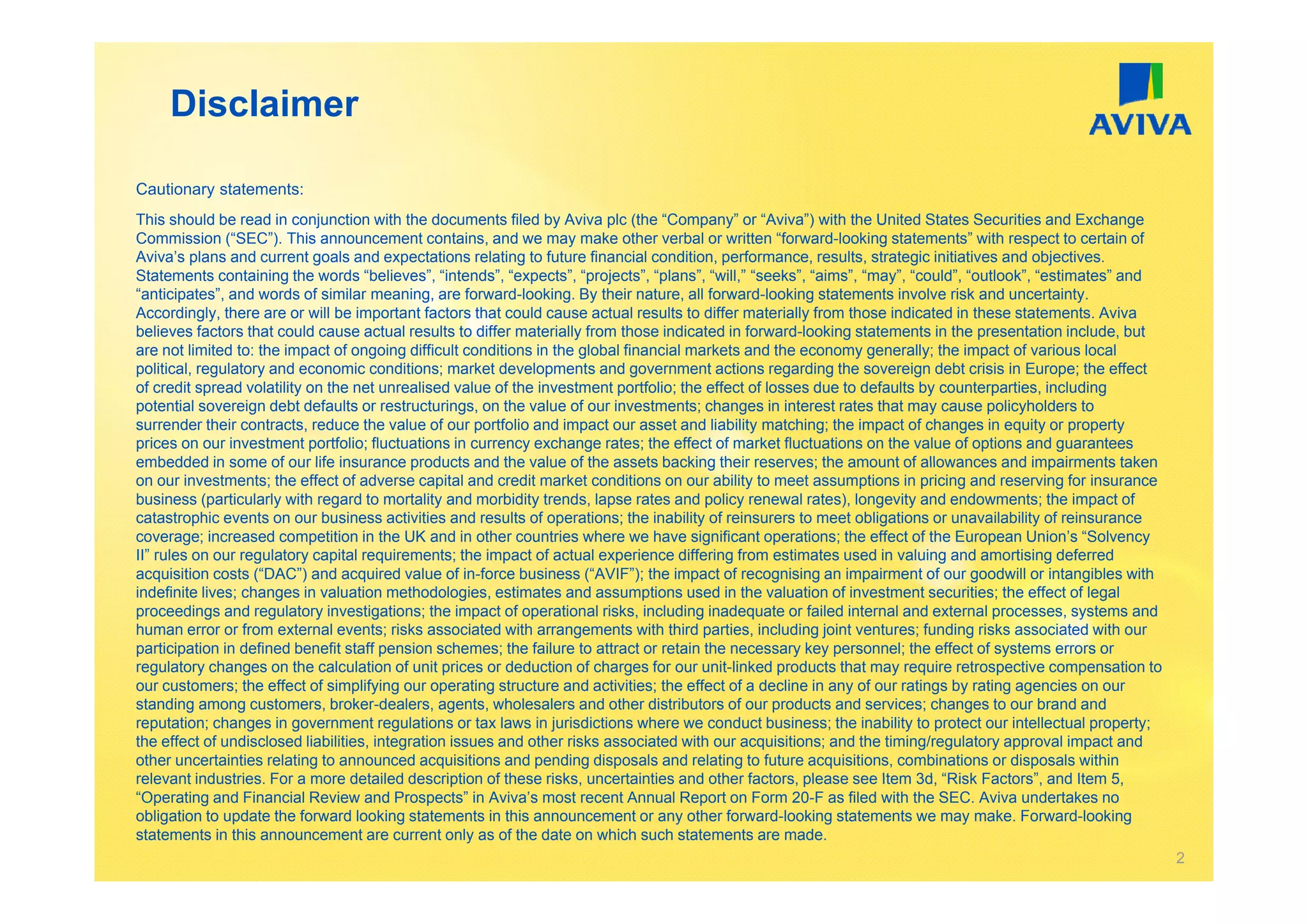 The document reports Aviva plc's 2012 financial results, highlighting a substantial after-tax loss of £3.05 billion primarily due to the sale of its US operations, while underlying operating profit decreased by 4% to £1.776 billion. Forward-looking statements emphasize the inherent risks and uncertainties the company faces, such as global economic conditions and credit market fluctuations. The company aims to improve cash flow, reduce leverage, and enhance its business operations while navigating various challenges stemming from the ongoing economic environment.