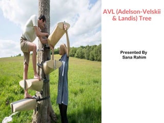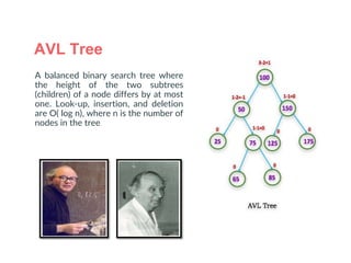 An AVL (Adelson-Velskii & Landis) tree is a self-balancing binary search tree where the height difference between subtrees is at most one, ensuring O(log n) time complexity for lookup, insertion, and deletion operations. It employs rotations to maintain balance during inserts and deletes, including left, right, left-right, and right-left rotations. The document illustrates insertion and deletion processes, demonstrating how to rebalance the tree as necessary.