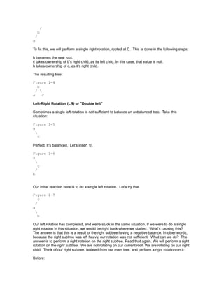 This document provides an overview of AVL tree rotations, including left, right, left-right, and right-left rotations. It explains how each rotation type works by restructuring the tree nodes. Examples are given with diagrams to illustrate single and double rotations. Guidelines are presented for determining which rotation type is needed based on whether the tree is right or left heavy and the balance of subtrees. The document aims to clarify rotations, an area that can be confusing when implementing AVL trees.