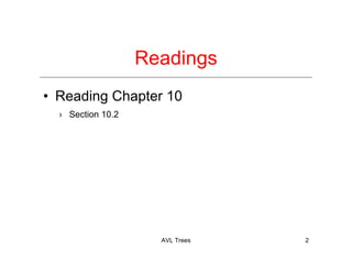 The document discusses AVL trees, which are a type of height-balanced binary search tree that maintain balance through rotations during insertions and deletions. It outlines the structure, properties, and various algorithms for maintaining balance, including single and double rotations. The document also compares the advantages and disadvantages of using AVL trees in data structures.